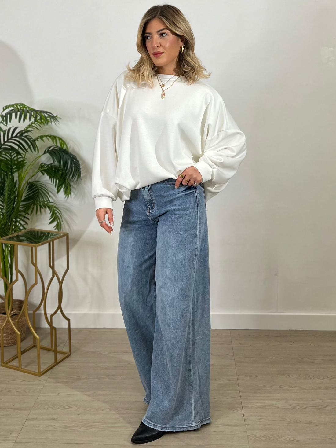 Jeans wide leg a vita alta, con gamba ampia e dritta che scende fluida fino...