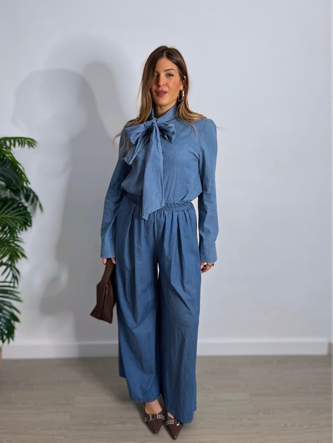 Camicia a maniche lunghe con chiusura a bottoni e fiocco al collo. Taglia unica, adatta...