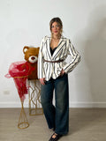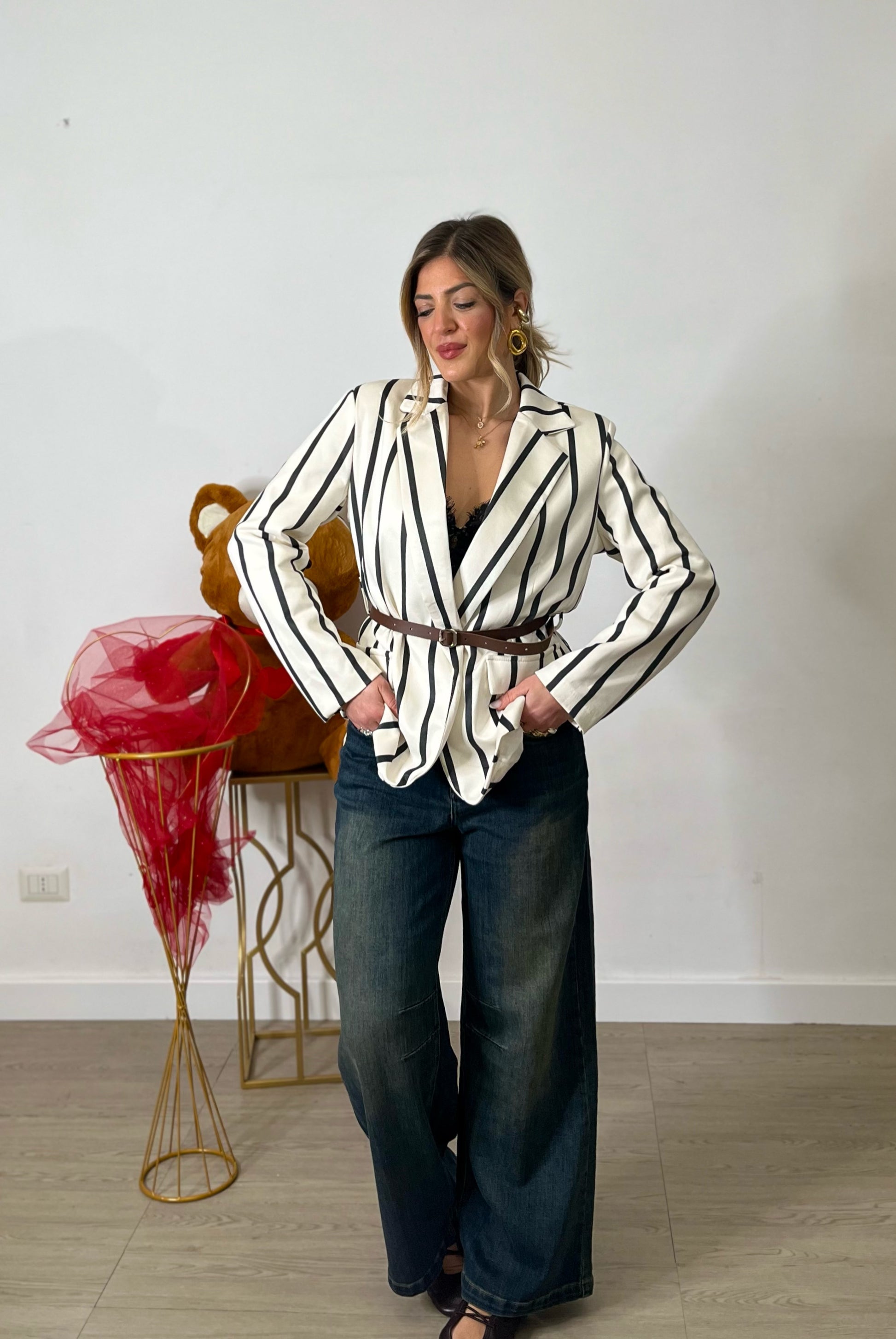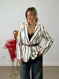 Blazer a righe verde petrolio con cintura rimovibile, senza bottoni.