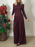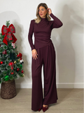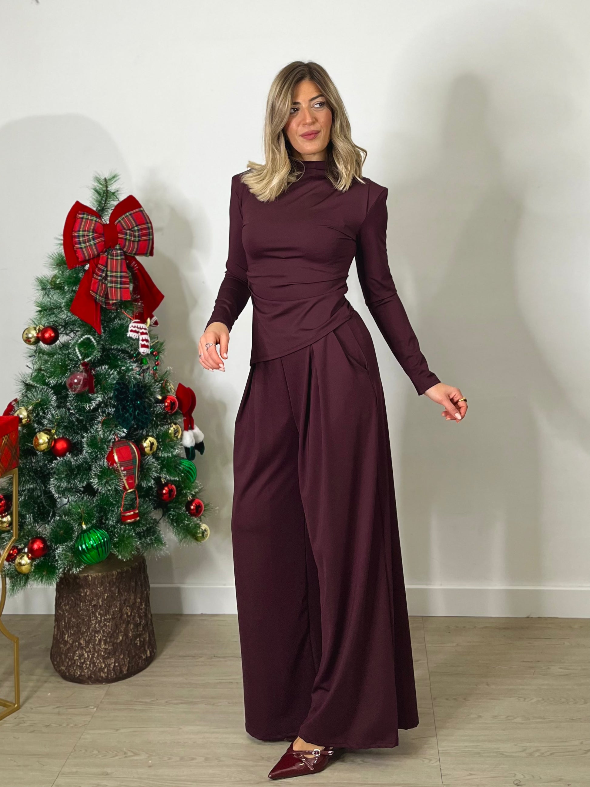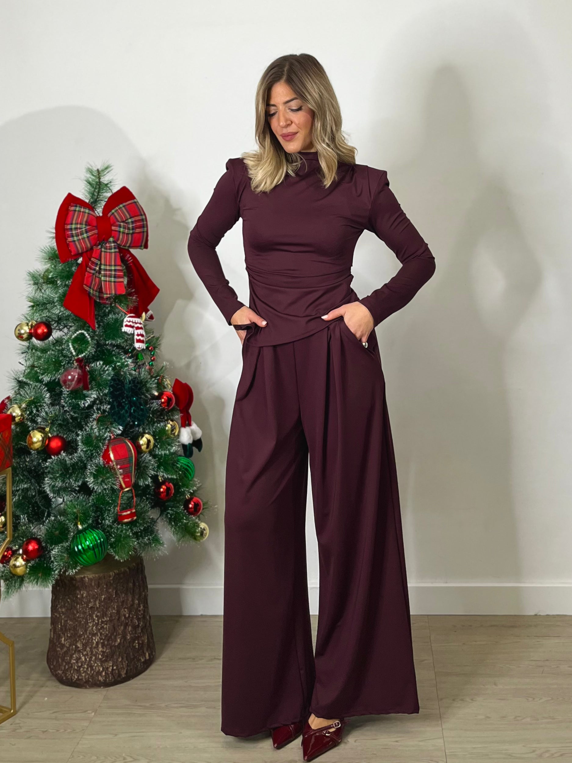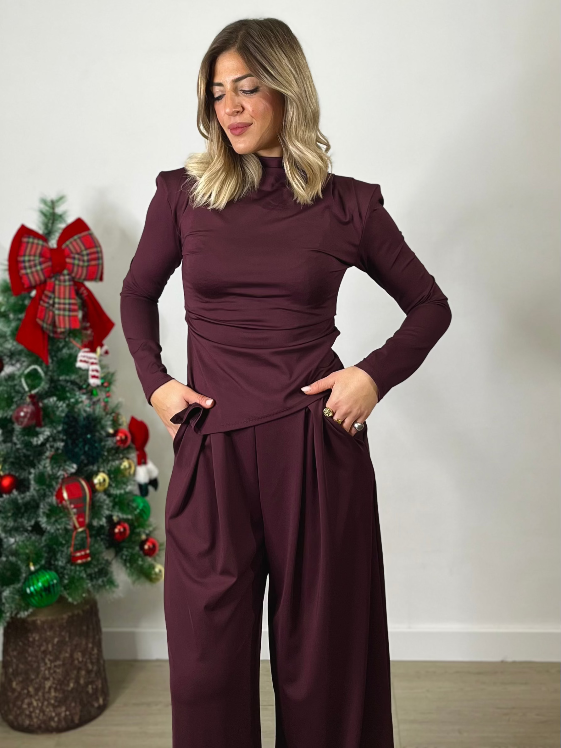 Coordinato elasticizzato e confortevole, composto da pantalone con elastico in vita e top con spalline imbottite e taglio asimmetrico.