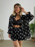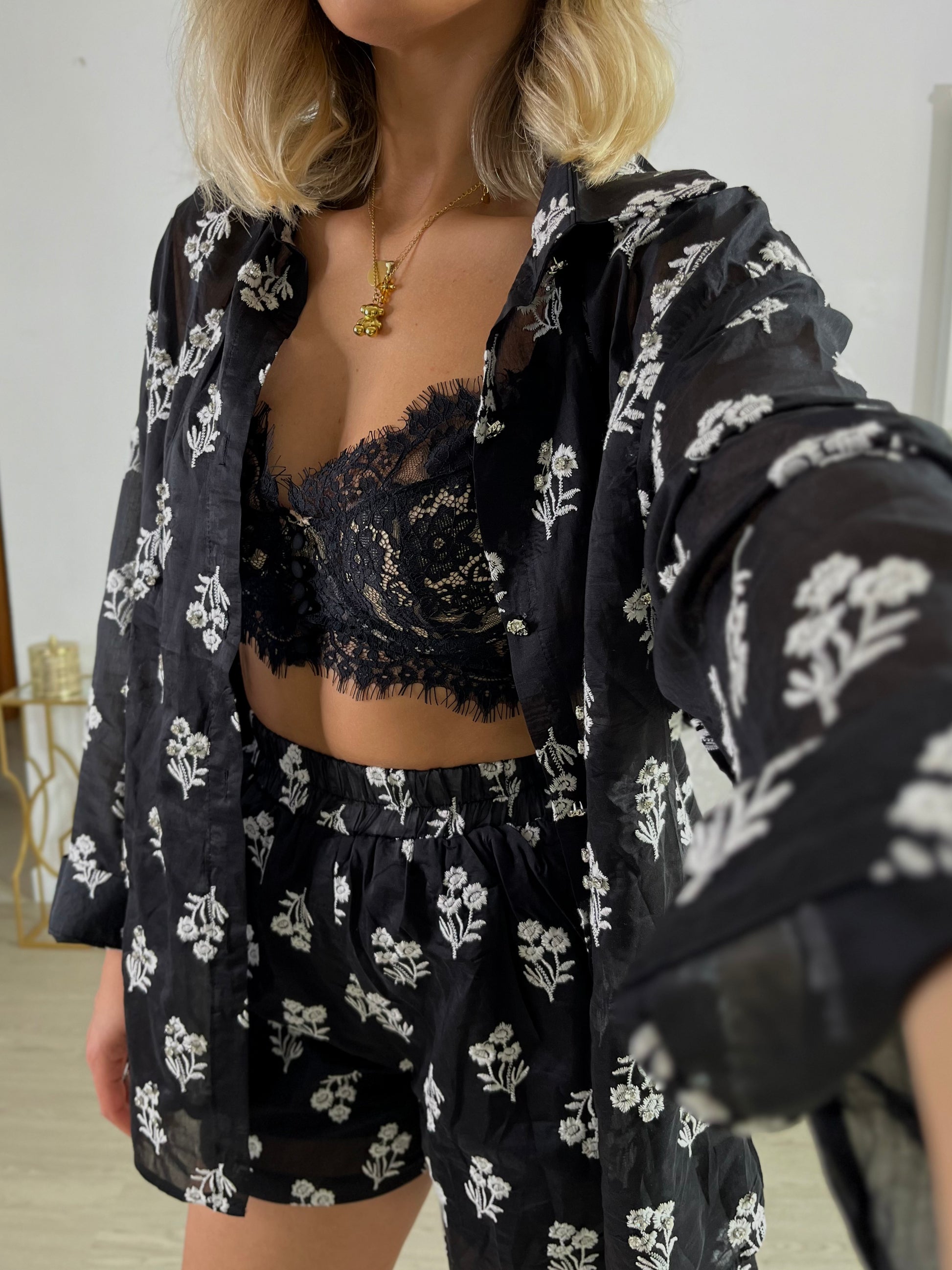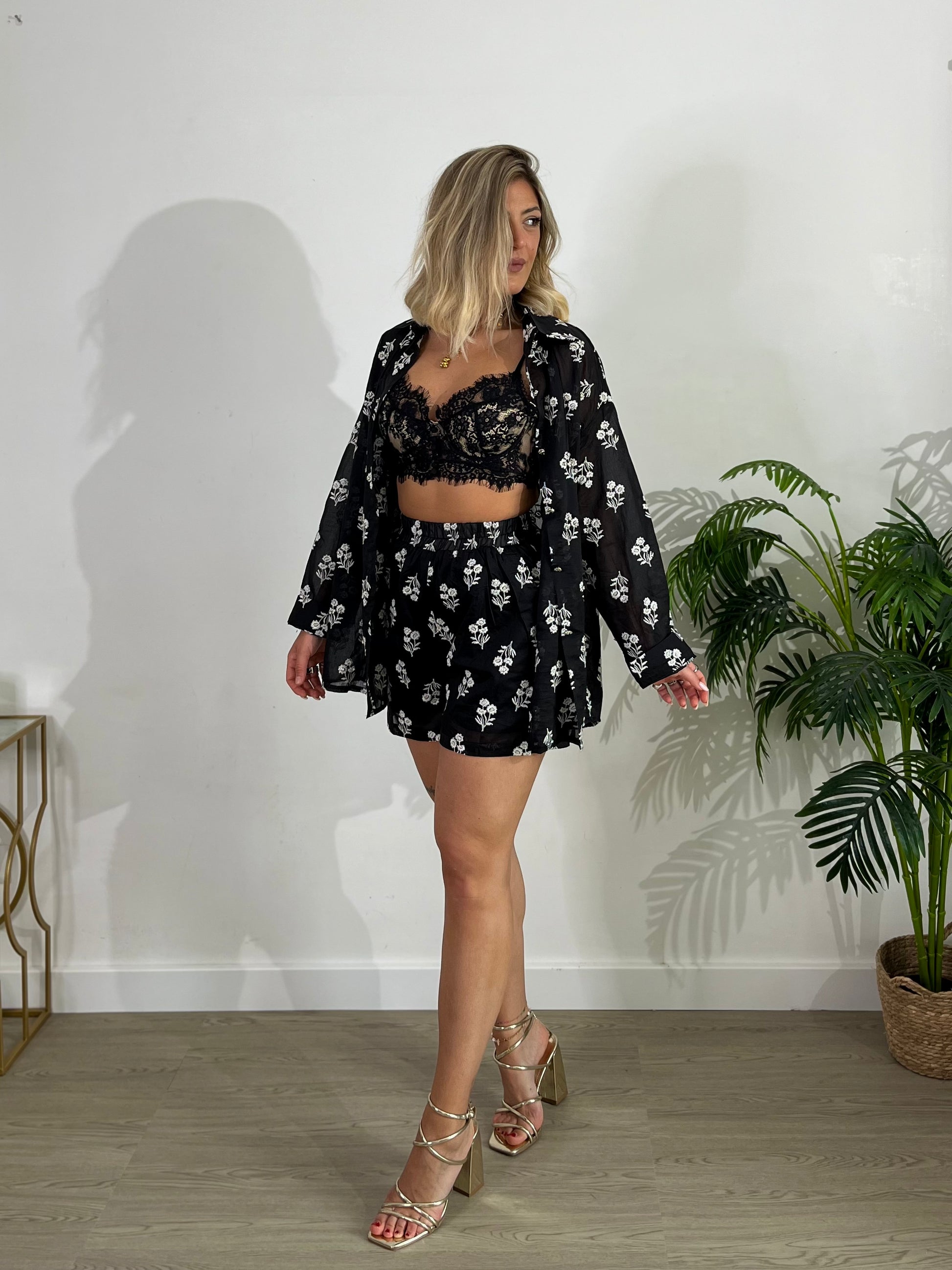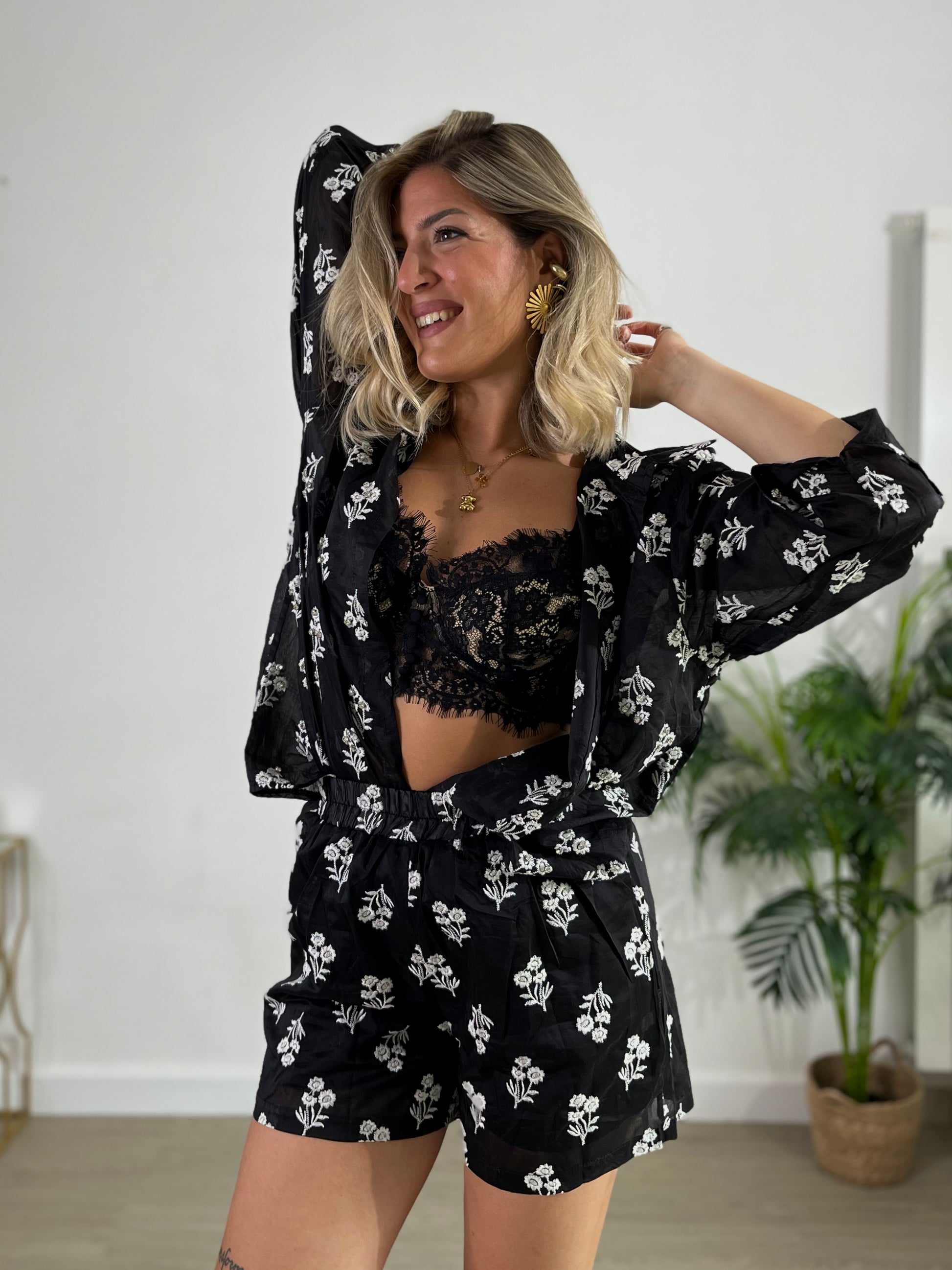 Coordinato 2 pezzi composto da camicia con decori e shorts con elastico in vita.