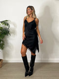 Abito in simil seta con taglio asimmetrico e bordo in pizzo a contrasto.