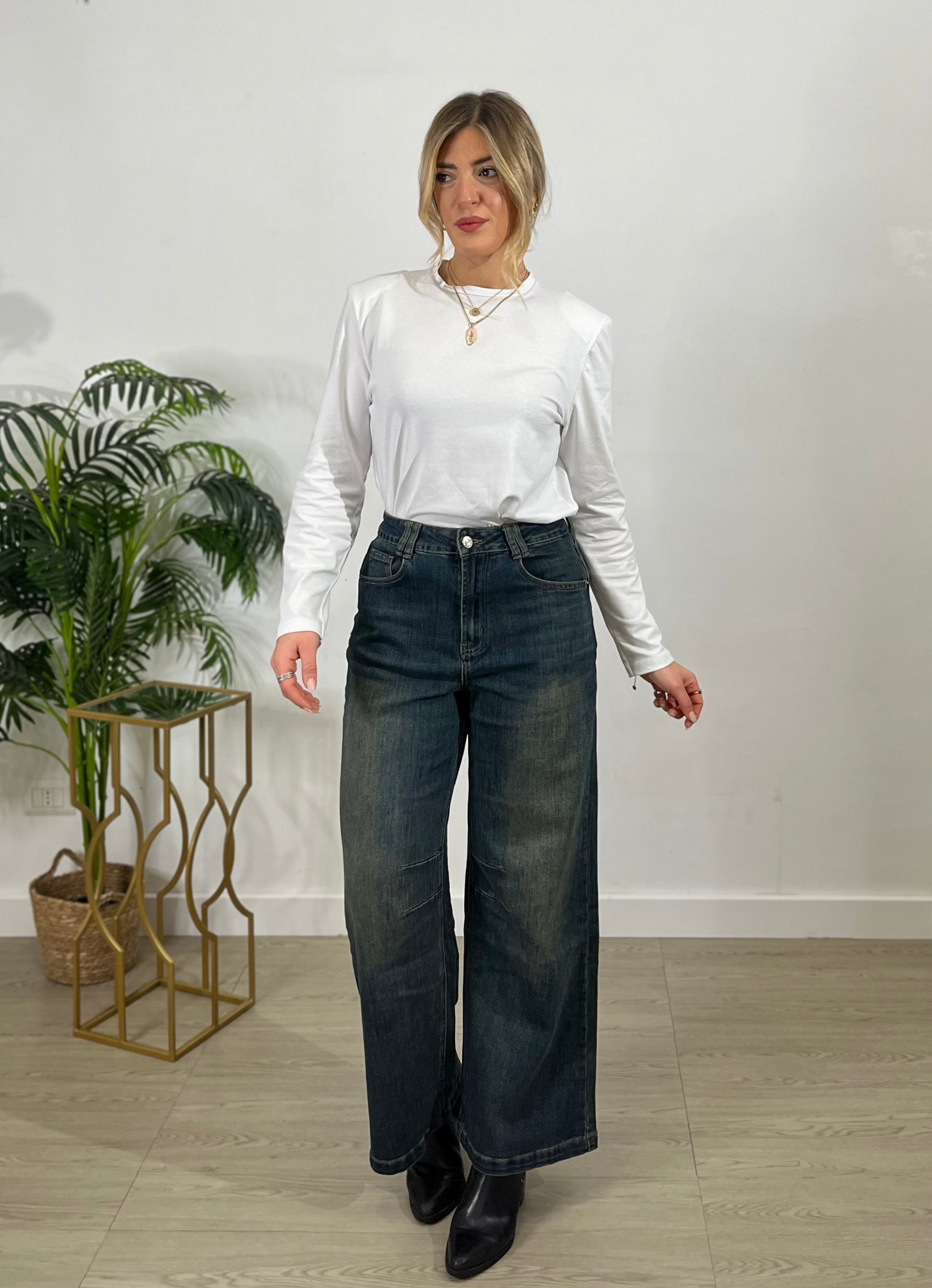 Lavaggio denim scuro con leggere sfumature effetto used che donano carattere senza appesantire.