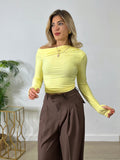 Top a maniche lunghe in tessuto elasticizzato, con leggero drappeggio sullo scollo che crea un effetto morbido e raffinato.