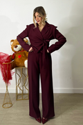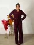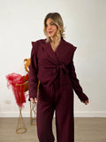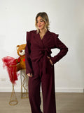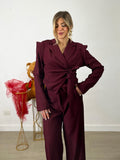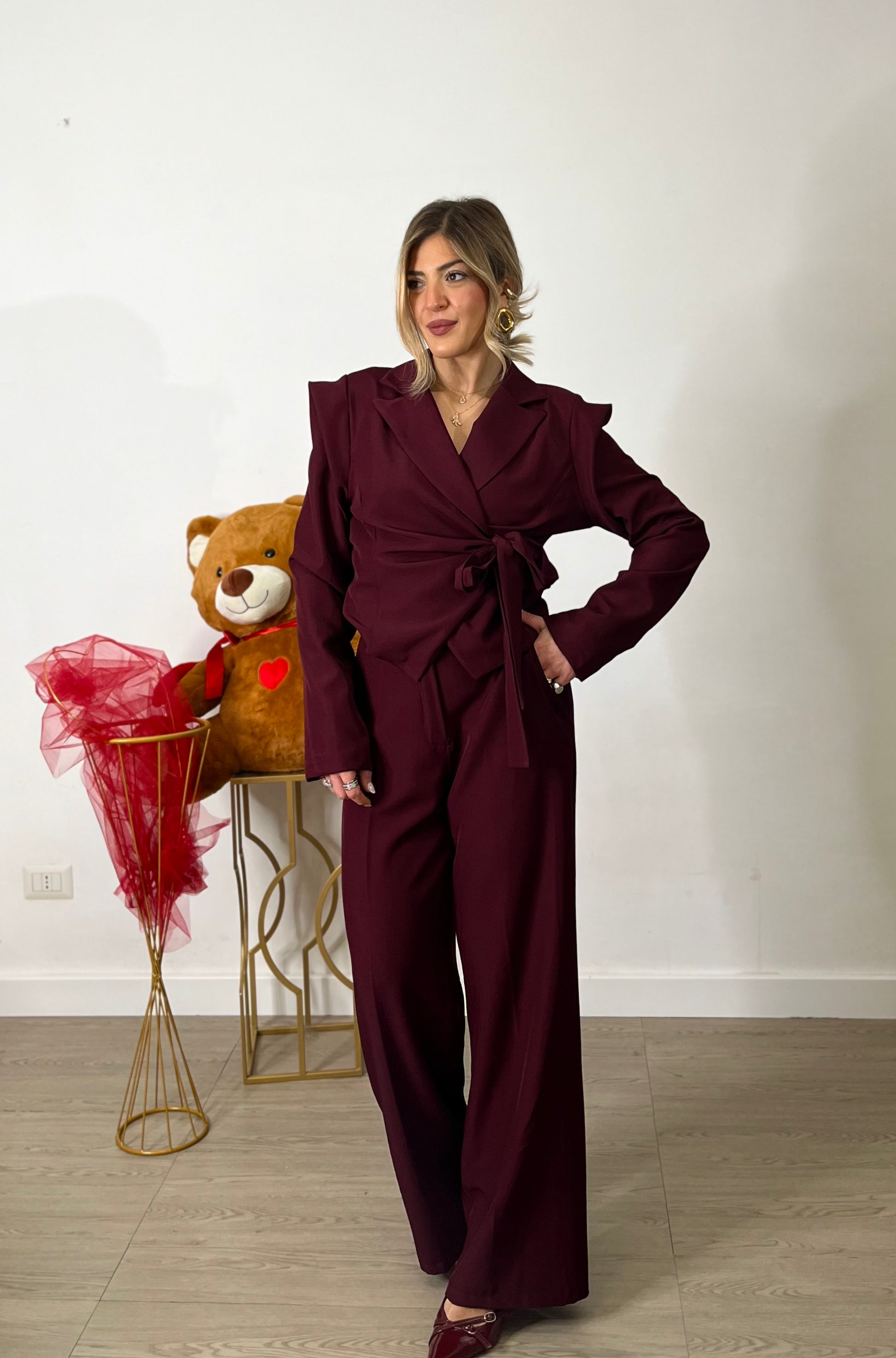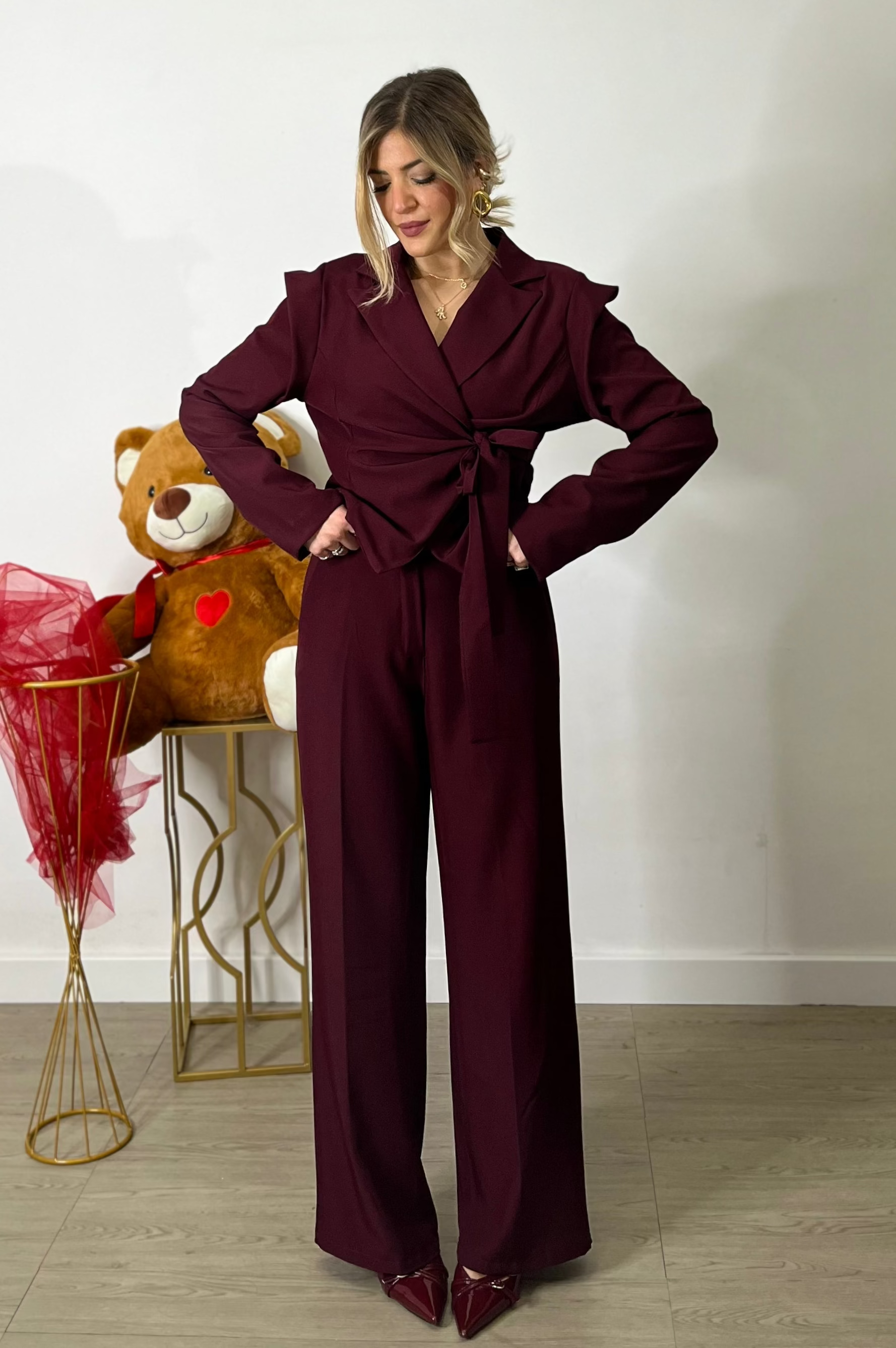 Tailleur composto da blazer crop a portafoglio con chiusura a nodo laterale e laccetto interno, abbinato a pantalone classico con chiusura a bottoni e zip.