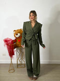 Tailleur composto da blazer crop a portafoglio con chiusura a nodo laterale e laccetto interno, abbinato a pantalone classico con chiusura a bottoni e zip.