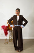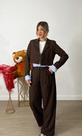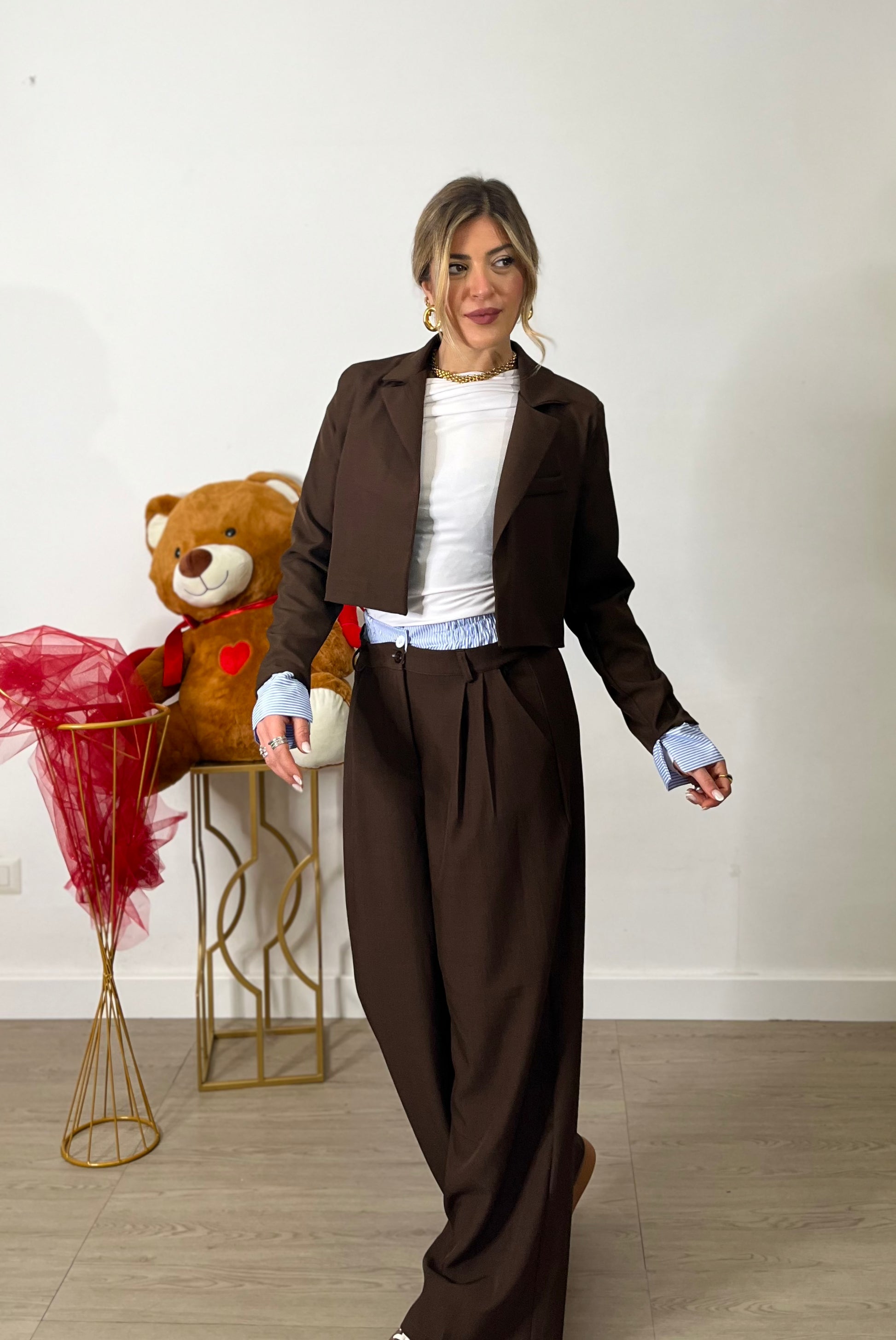 Tailleur composto da blazer crop con inserti effetto camicia sui polsi e pantalone con elastico a contrasto, chiusura con bottoni e zip, elastico sul retro.