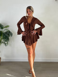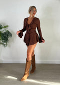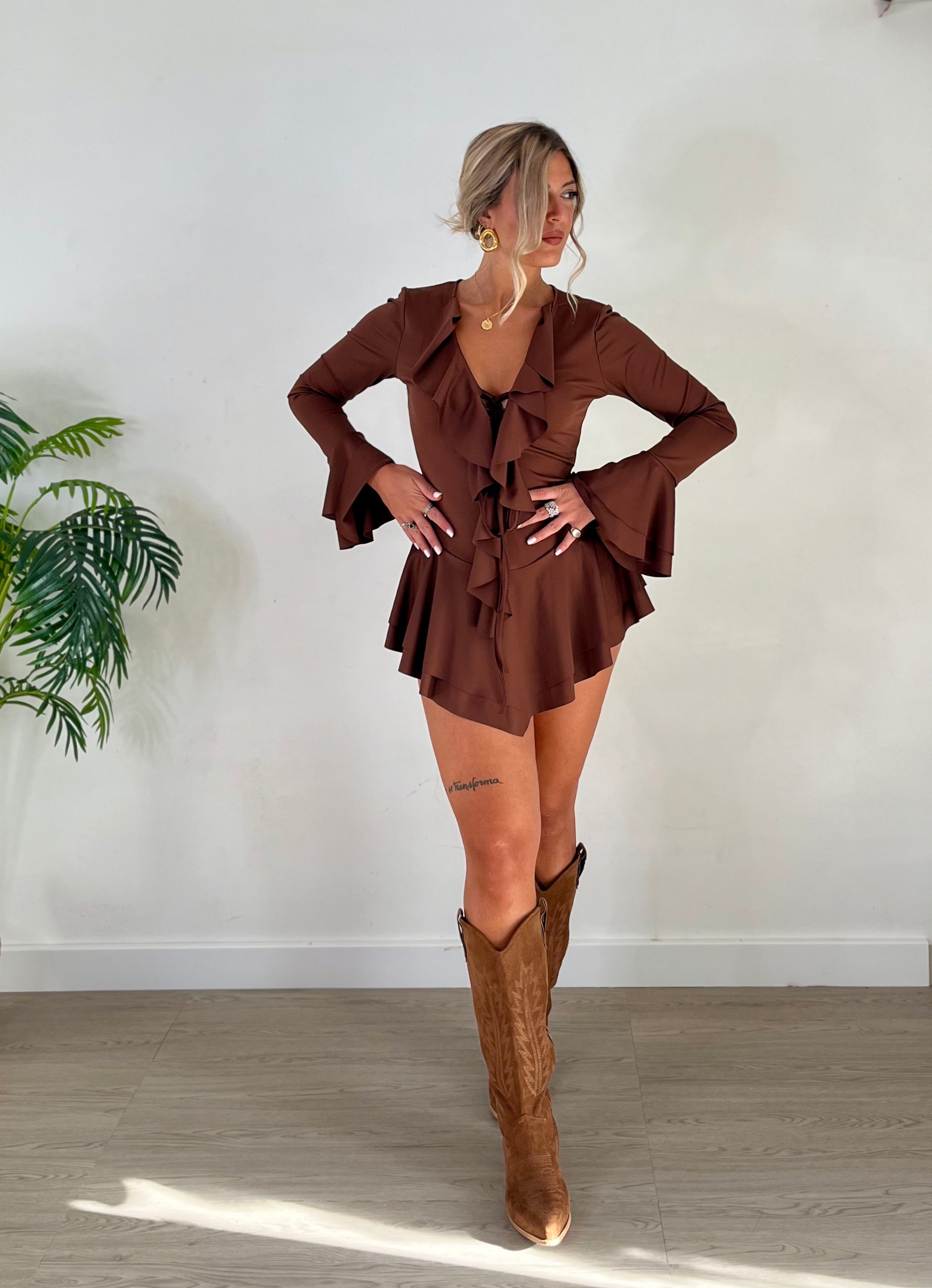 Tutina elasticizzata a maniche lunghe, con scollo a V e delicati dettagli sul colletto e sui polsi.